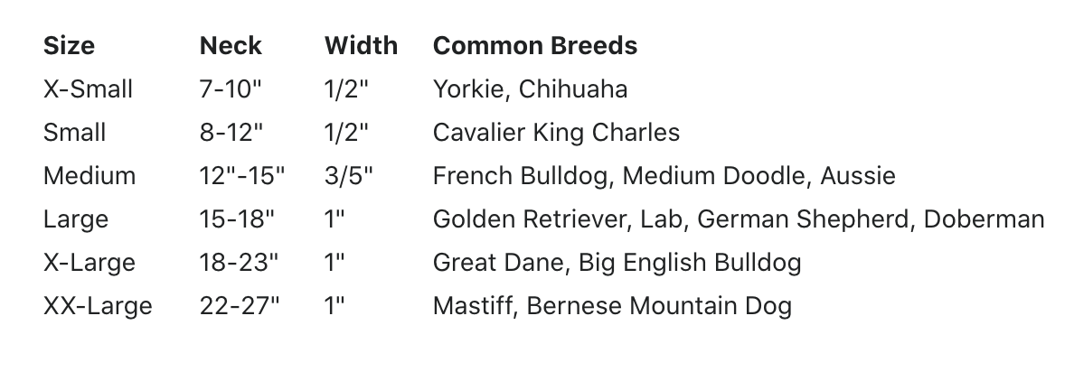 | Size | Neck (in) | Width (in) | Common Breeds |